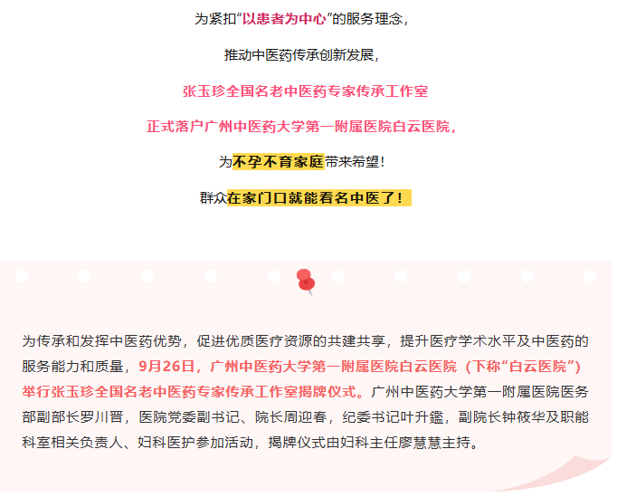 张玉珍名老中医药专家传承工作室2017年9月起成为全国名老中医药专家传承工作室、广东省名老中医药专家传承工作室。本工作室由广州中医药大学第一附属医院妇科赵颖、廖慧慧教授负责,主要成员包括正高6人,副高1人,中级5人。工作室成员本着严谨求实的精神,开拓进取的态度,力图在继承的基础上创新、发展,目前已形成了有鲜明特色的优势病种诊疗方案5种,包括多囊卵巢综合征、盆腔炎性疾病后遗症、卵巢早衰、子宫内膜异位症、复发性流产诊疗方案,以上方案已在本院广泛使用,并在省内外多家医院应用,疗效显著。工作室目前已经发表张玉珍名老中医专家学术经验相关论文多篇,出版相关专著,开展相关课题多项。廖慧慧教授表示,目前白云医院妇科借分工作站成立契机,将全面在医疗服务、带教教学、科研发展等方面进行不断发展和提升,为打造特色专科不断努力。