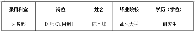 各相关人员:经过面试考核及体检等程序,经医院领导讨论决定,拟择优录用陈卓峰。现将拟录用人员名单予以公示,公示时间为五个工作日,从2025年9月15日起至2025年9月19日止。